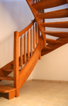 Schodiště samonosná Samonosné schodiště tvoří funkční celek.Stupně jsou zafrézovány do bočnic a sloupků - spojením těchto dílů je tvořena nosná konstrukce. Toto schodiště vyrábíme nejčastěji ve tvaru L (jednou lomené), U (dvakrát lomené - stejným směrem) a S (dvakrát lomené - jednou vpravo jednou vlevo). Nejjednodušší schodiště ve tvaru I (prosté) je samozřejmostí, nicméně není příliš časté. Další variantou je vřetenové schodiště se středovým sloupem. Zatáčky u lomených schodišť jsou tvořeny lichoběžníkovými stupni nebo podestami. Kombinace lichoběžníkových stupňů a podest je také možná i poměrně běžná. Vše záleží na představě zákazníka a prostoru, který je k dispozici. Podesta je prostorově náročnější. Na otevřené straně je schodiště vybaveno zábradlím. To je tvořeno sloupky, madly a výplněmi (většinou svislé soustružené prvky). Schodiště může být dále vybaveno samostanými madly na zeď.